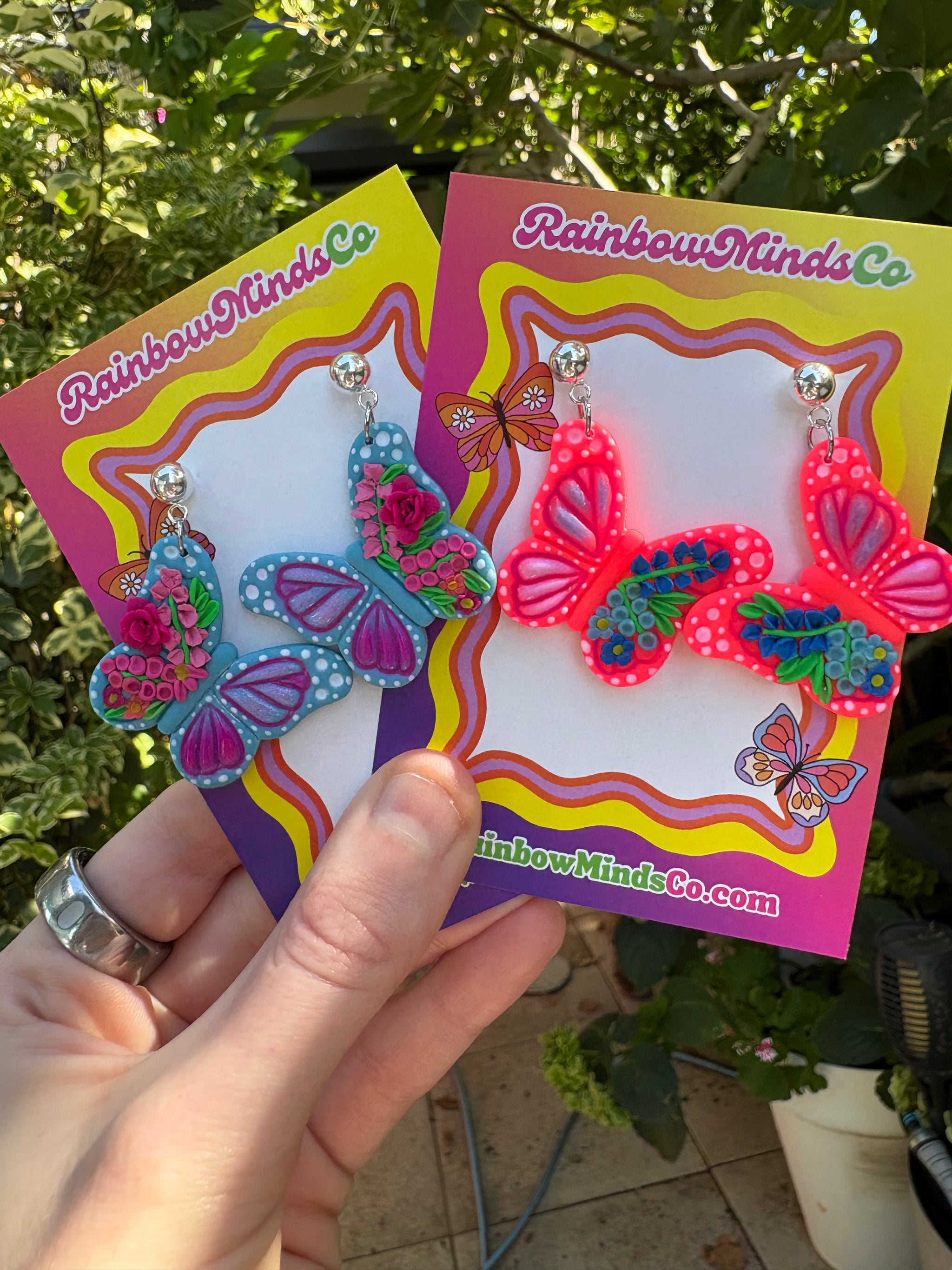 Catch the magic of nature with these stunning handmade polymer clay butterflies in vibrant fluoro pink. Each delicate wing features intricate blue floral details, hand-sculpted for a one-of-a-kind look. Crafted with surgical stainless steel findings, these beauties are built to last through everyday wear for sensitive ears. Perfect for adding a pop of colour and whimsy to your jewellery collection- because life's too short for boring accessories!