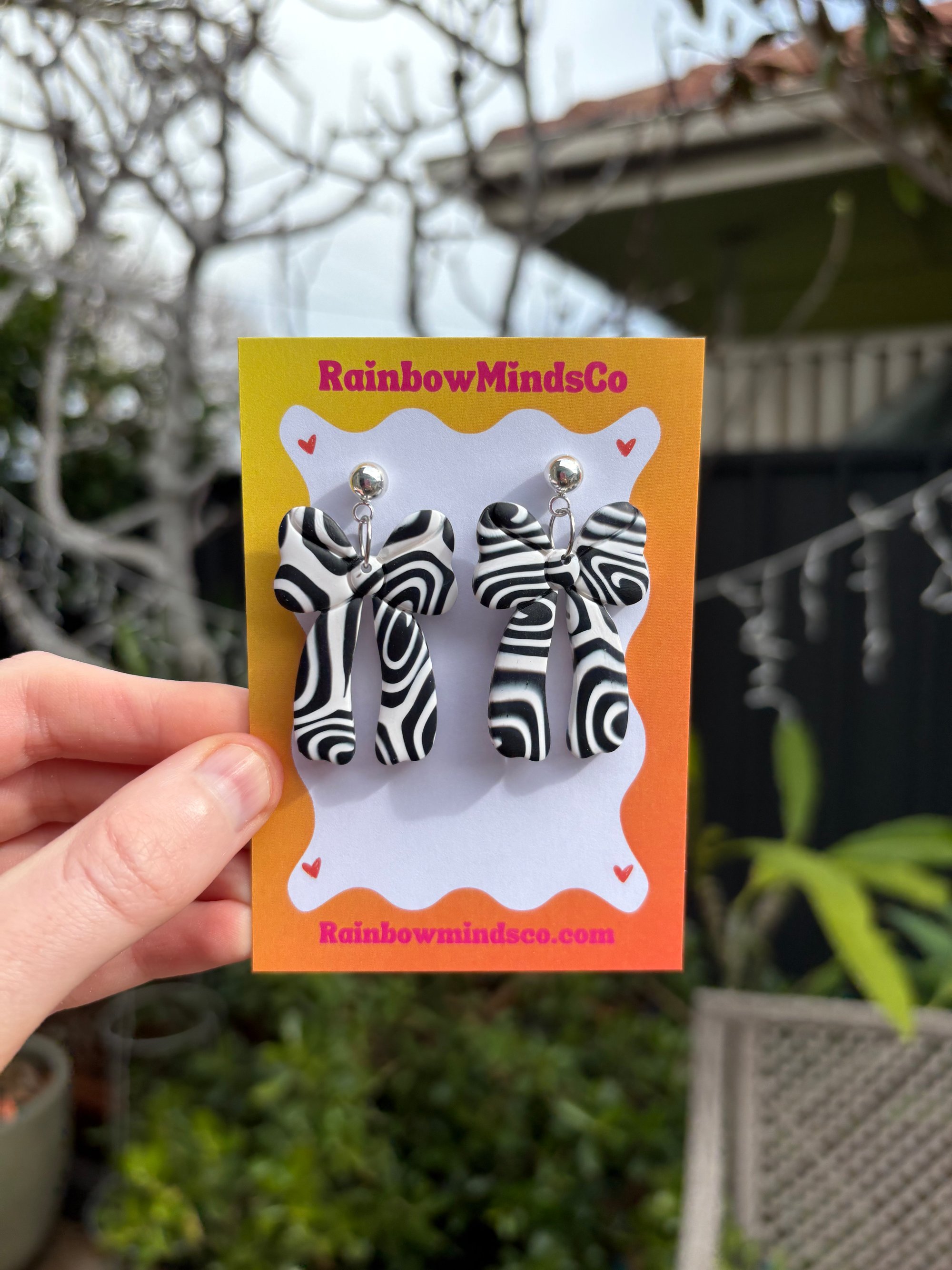 Add a pop of retro sweetness to your outfit with our Swirl Bows! These statement earrings feature black and white swirly stripes in a playful bow shape, handcrafted from lightweight polymer clay. Perfect for lovers of quirky, nostalgic vibes and bold colour palettes. Each pair is unique, just like you.
