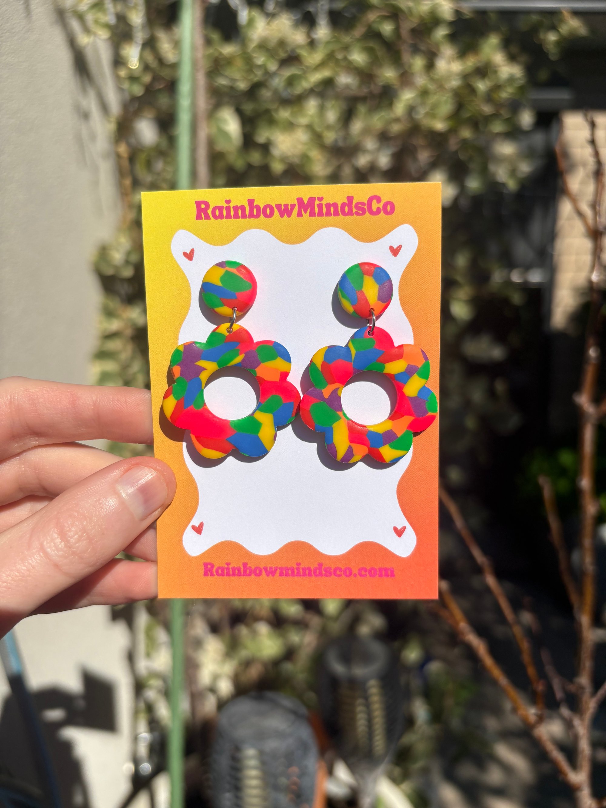 Bursting with joy, these vibrant flower hoop-style dangles are like a party you can wear. Featuring a kaleidoscope of rainbow polymer clay pieces, they bring instant fun to any outfit while staying lightweight and comfy all day long.