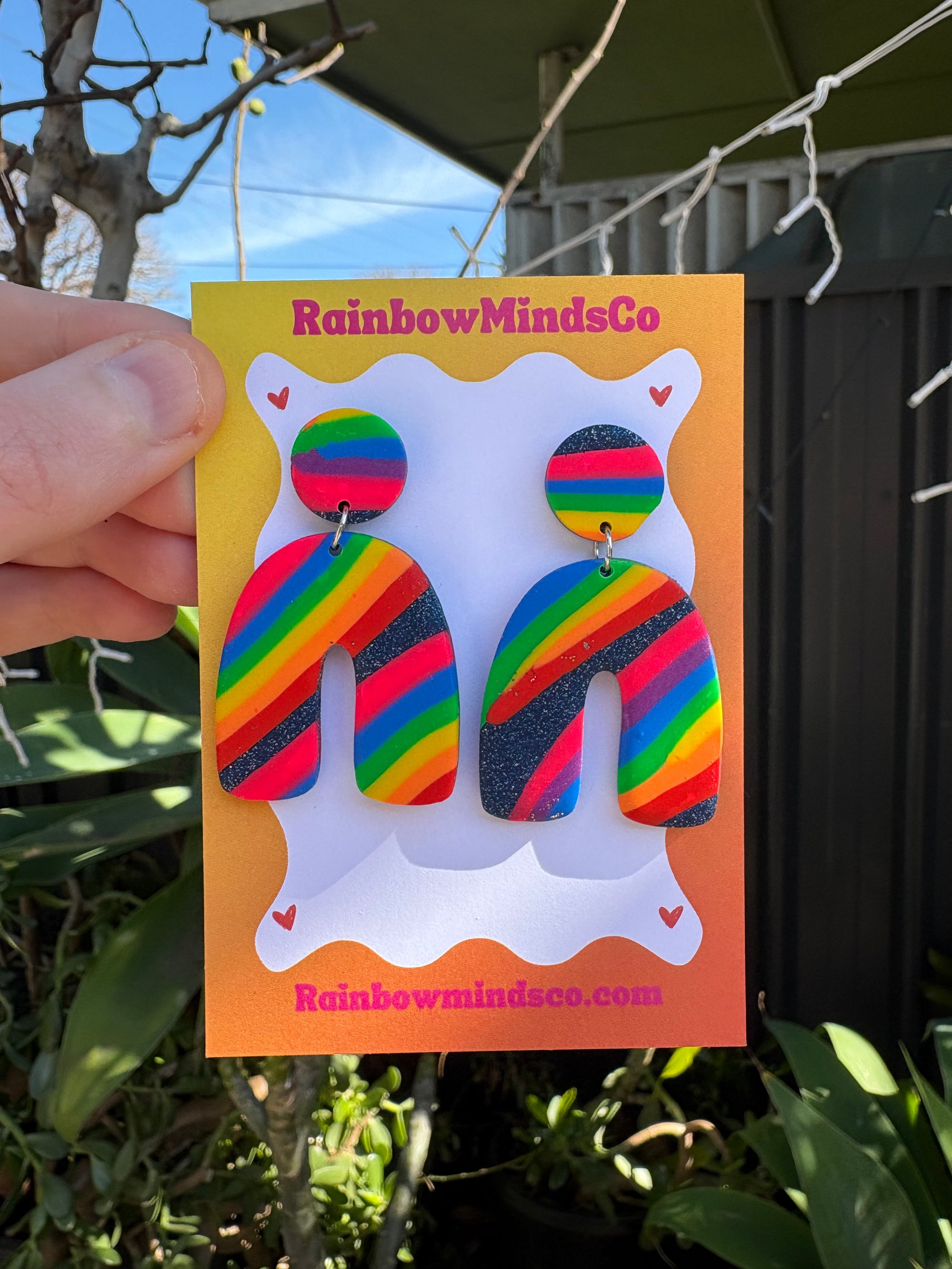 Striking rainbow arches against a midnight shimmer backdrop. These bold, artsy dangles celebrate diversity and colour in their brightest form.