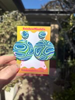 Oversized circular dangles with mesmerising blue and green swirls reminiscent of tidal pools and lush lagoons. Lightweight yet striking, they’re made to turn heads and spark conversation.