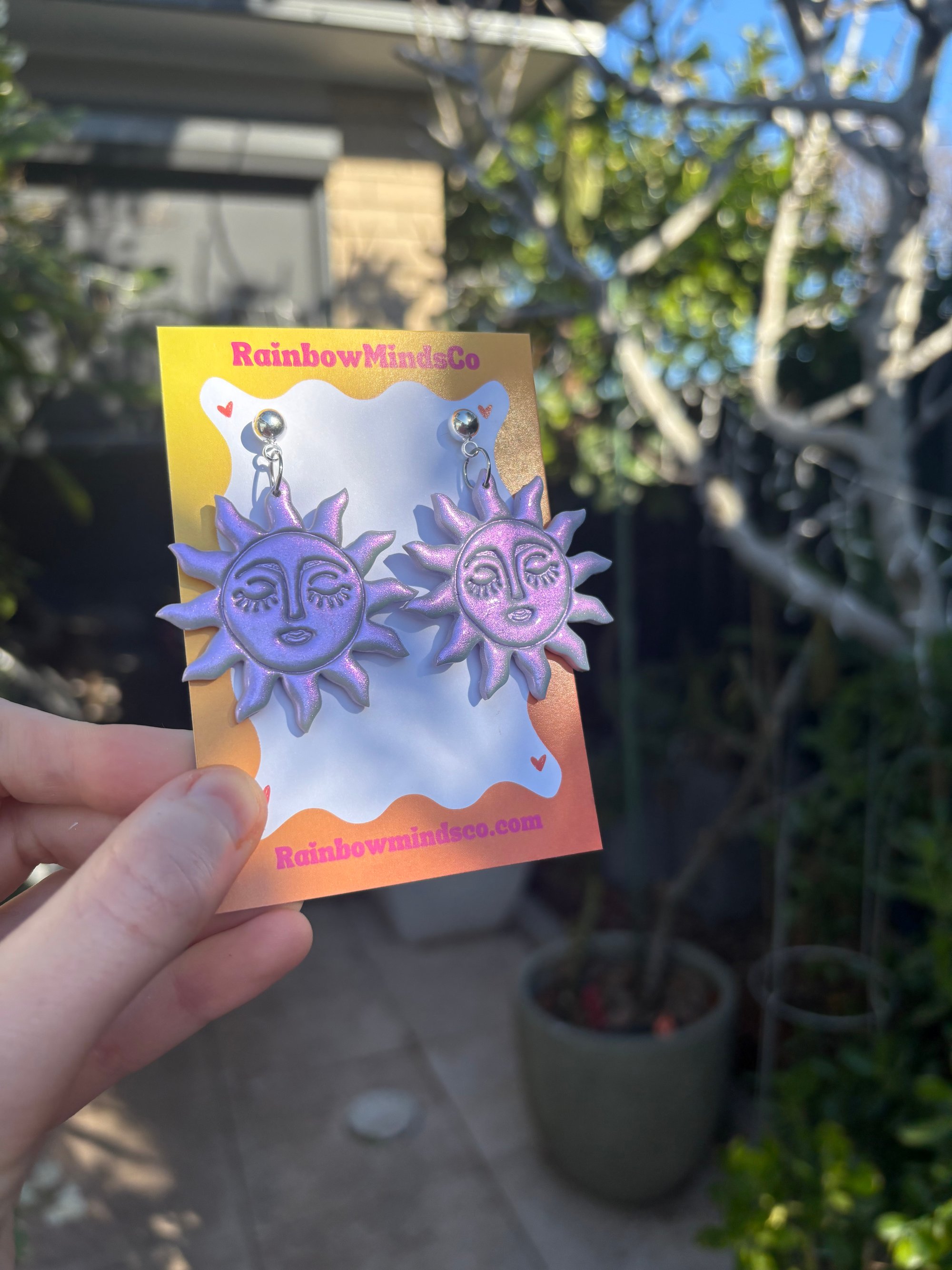 Bring a burst of sunshine wherever you go with our Golden Gaze earrings. Featuring radiant sun faces with closed eyes and serene expressions, these shimmery lilac beauties are all about positive vibes and warm energy. Covered with sparkly pigment powder which shows a pink tint in different lighting and finished with a high gloss sealant. Handmade from polymer clay and finished with silver surgical stainless steel findings for sensitive ears, they’re the ultimate statement piece for dreamers and daylight chasers.