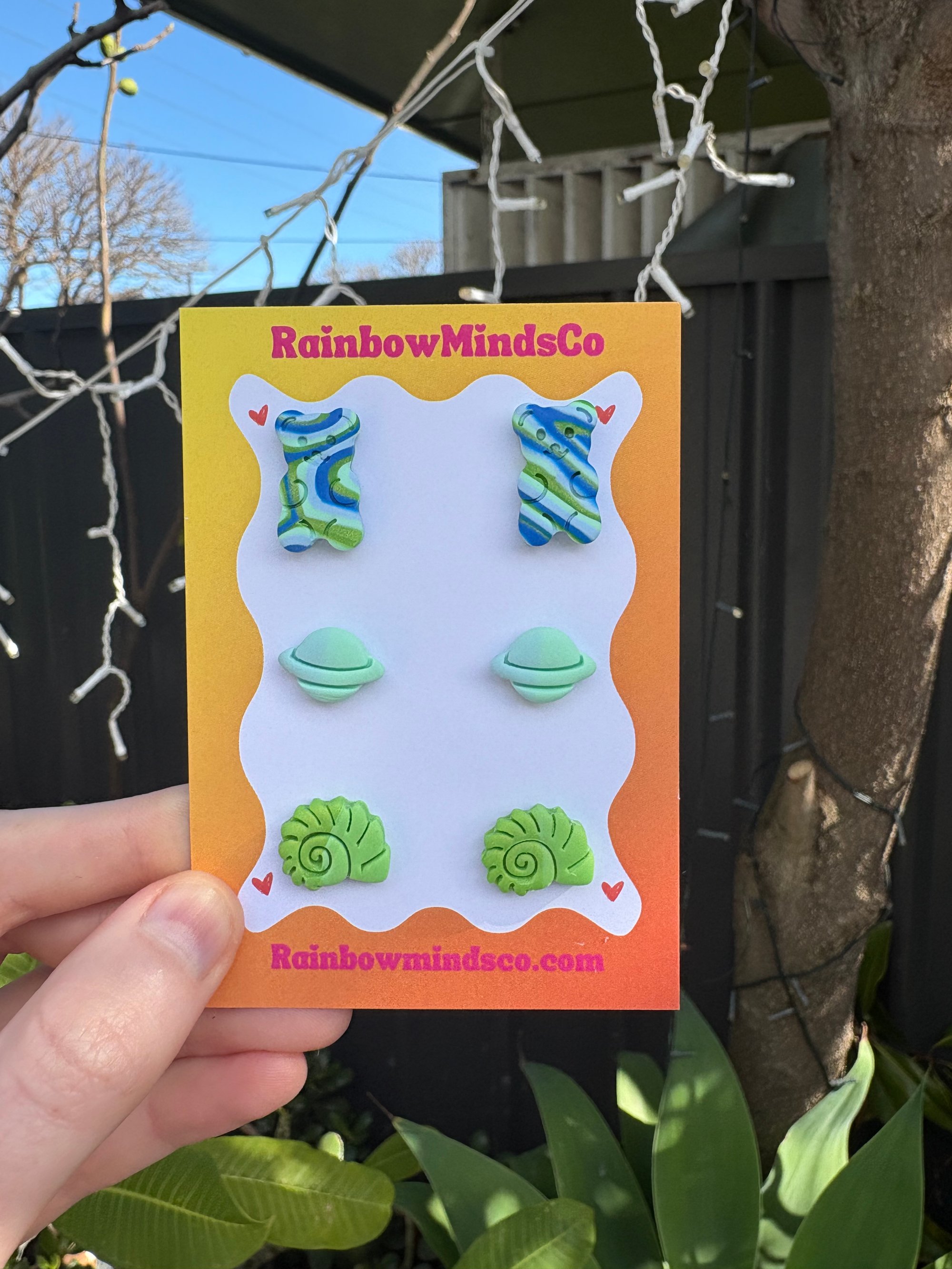 A whimsical three-pair set inspired by underwater wonders-abstract gummy bears, mini planets and shells in calming blue and green hues. Perfect for mix-and-match wear or gifting. Finished with surgical stainless steel findings.