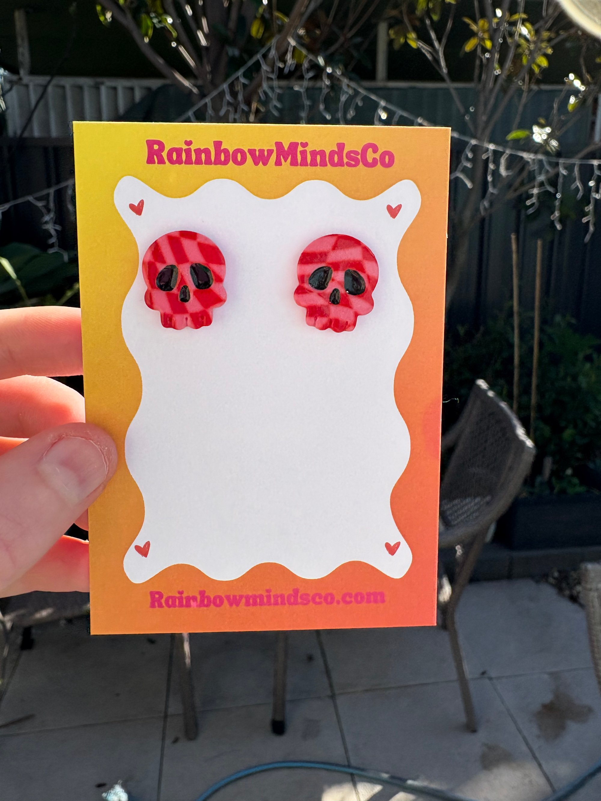 Tiny red skull studs with a playful twist-featuring a cheeky checker overlay. Equal parts spooky and cute, they bring a touch of gothic charm to everyday wear.