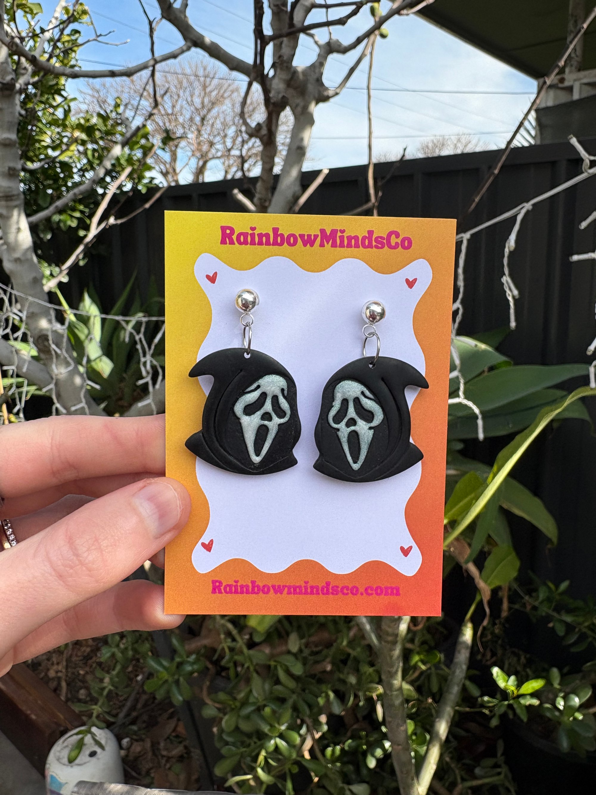 Spooky but sleek-these Scream mask earrings have a subtle sparkly mask, making them stand out day or night. Perfect for Halloween and lovers of GhostFace.