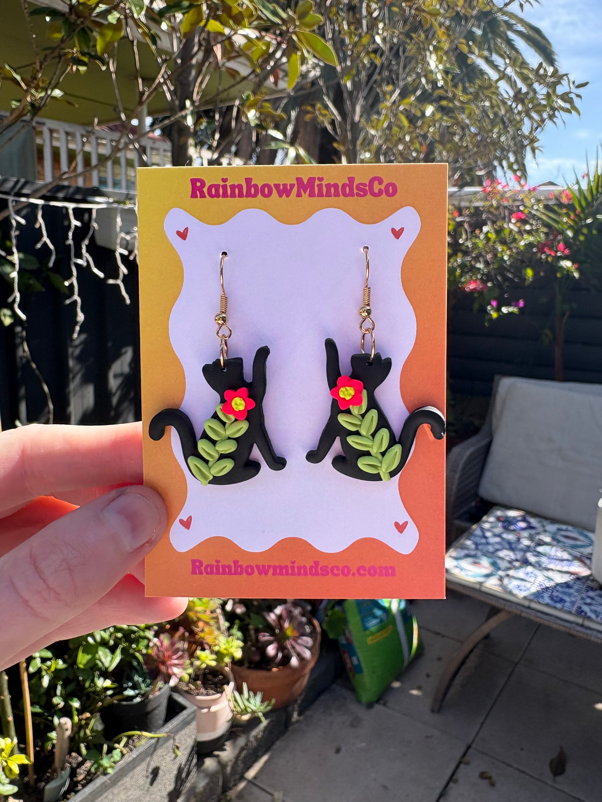 Bold and enchanting, these black cat earrings feature vivid pink flowers nestled among lush green leaves. A striking mix of mystery and playfulness, they’re the purrfect statement piece. Finished with gold surgical steel hooks.